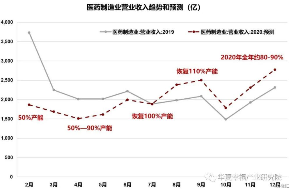 受疫情影响,2020年2月是疫情最严重、相关管控最严格的月份,因此预计一季度的医药制造业营收仅能达到去年50%的水平,二季度逐渐恢复至80%。下半年企业背负拉平全年业绩目标的压力,将会回补上半年缺失的营收。预计2020年医药制造业总体营收约下降10-20个百分点。