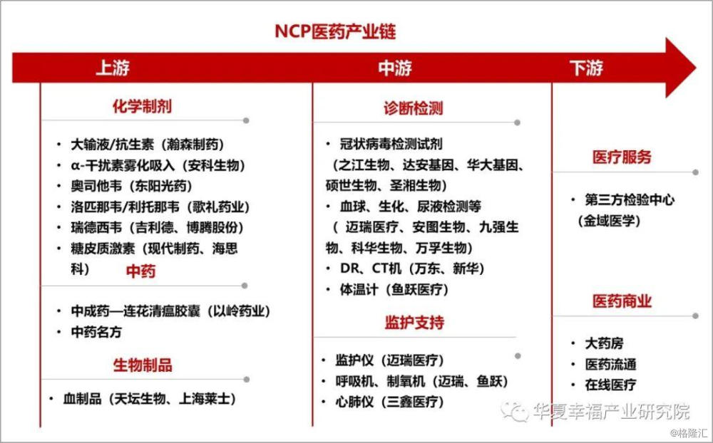 NCP产业链上游:药品成为抗疫硬核武器,探寻有效治疗和预防的新思路。不管是针对治疗的老药新用,还是围绕治疗必须的常规药品,均在疫情管控下加紧研发、生产,逆势增产来满足需求。