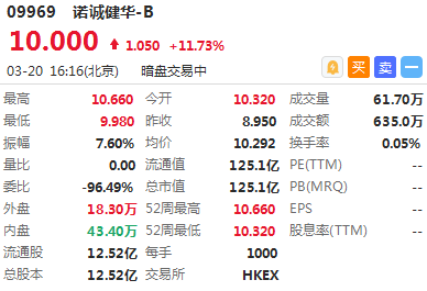 华盛资讯3月20日讯,诺诚健华-B暗盘交易于16:15开启,暗盘高开15.3%,截至16:16报价10港元,较发行价涨11.73%,最新成交额635万港元,总市值为125.1亿港元。