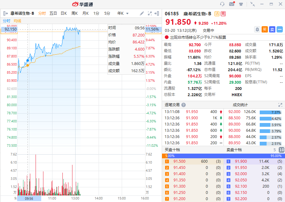 华盛资讯3月20日讯,康希诺生物-B(06185)盘中异动,股价一度大涨11.2%。截至发稿,康希诺生物-B大涨11.2%,现报91.85港元每股,当前成交额1.524亿,换手率1.29%,总市值为204.7亿港元。