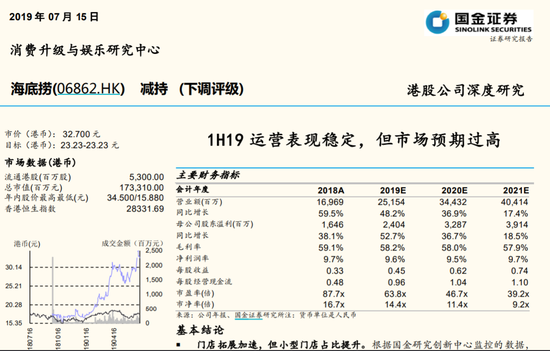 新浪财经讯 3月20日消息,今日国金证券发布研报,对海底捞大幅看好,上调评级至增持,并给予34.5港元的目标价,较19日收盘价有19%升幅。不过,2019年在券商集体唱好的时候,国金唱空海底捞下调评级至减持,指有30%下跌空间。时隔半年,由唱空转为唱多,被打脸的国金到底如何看待海底捞?