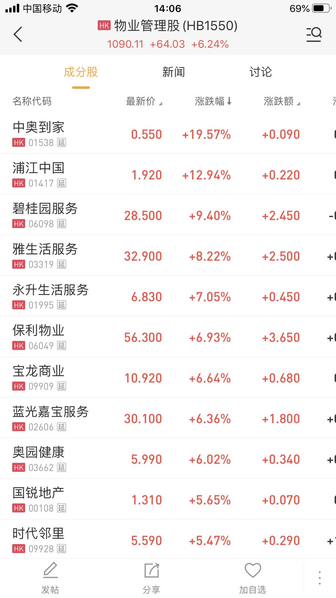 华盛资讯3月20日消息,港股物业管理板块在下午出现普涨行情。截至发稿,中奥到家大涨19.57%板块领先,浦江中国、碧桂园服务、雅生活服务涨幅分别有12.94%、9.4%、8.22%。其他上涨的物业股还包括永升生活服务、保利物业、宝龙商业、蓝光嘉宝服务、奥园健康等。
