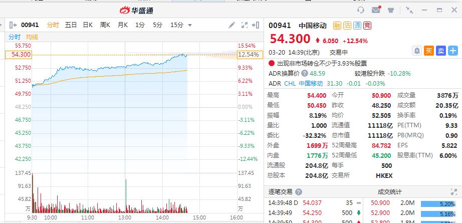 新浪财经讯 3月20日消息,中国移动今日爆发,股价暴涨12.64%,报价54.5港元,单日市值飙升1260亿港元,放量成交。中国移动近13%的涨幅,也创造了自2008年10月以来的最大涨幅,为恒指贡献113点。