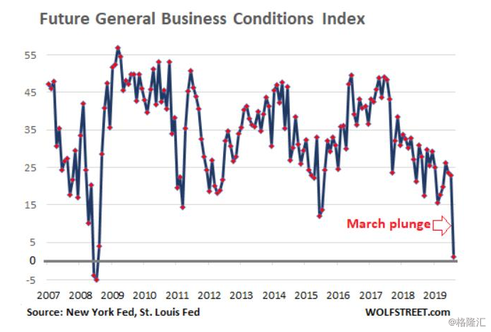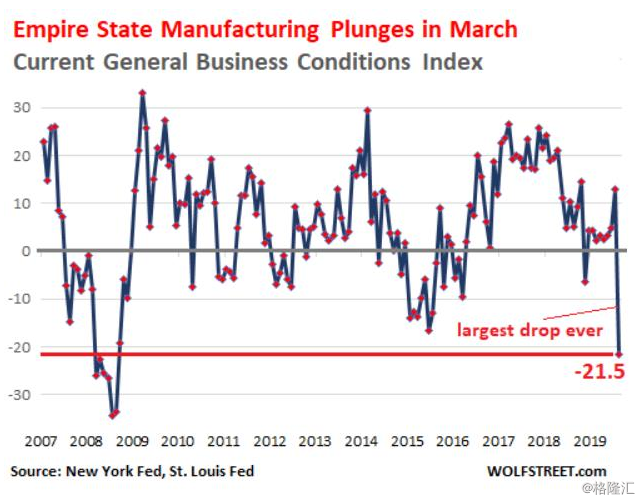纽约联储公布的帝国制造业指数(Empire State Manufacturing index)下滑34.4点,为史上最大下滑幅度,从2月份仍相对乐观的12.9点跌至负21.5点,为2009年以来的最低水平。历史上,该指标也曾达到当前的低水平,那是2008年10月,当年9月雷曼兄弟破产。