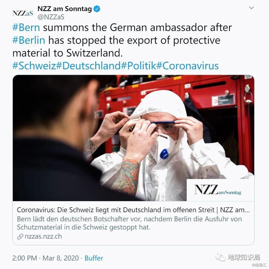 还有一个影响因素是,瑞士不属于欧盟国家,即使医疗物资被抢也没处告状,无法向欧洲理事会申请仲裁,向其他国际组织申诉则更没有实际意义。单方面和德国政府交谈是瑞士唯一的办法。