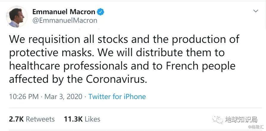 讲两句:法国的口罩只能留在法国,给法国人用!又有点法兰西内味了。(图片来自:Emmanuel Macron/twitter)