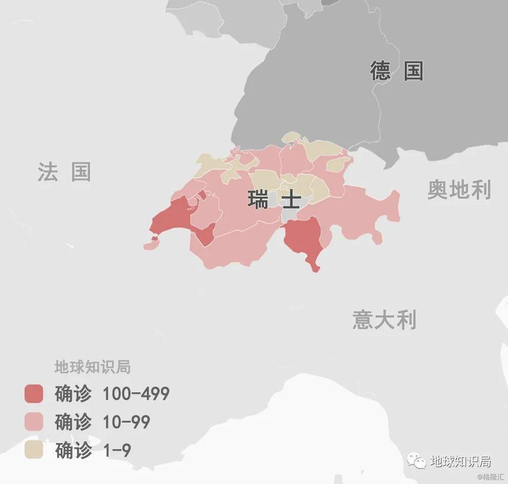 瑞士在面积、人口上都是个小国,但疫情却一点都不轻,由于紧靠意大利,压力比德国要大很多。(3月11日,瑞士新冠疫情确诊分布)