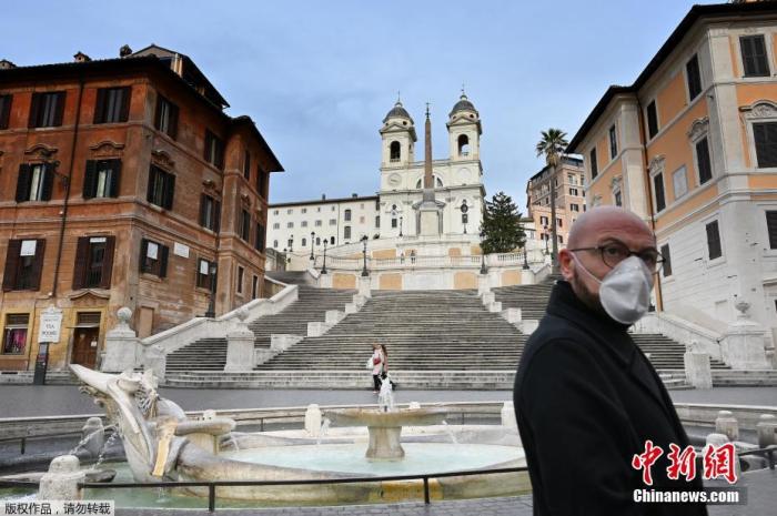 资料图:当地时间3月12日,意大利罗马市中心斯帕尼亚广场,一名戴着防护面具的男子走过台阶。