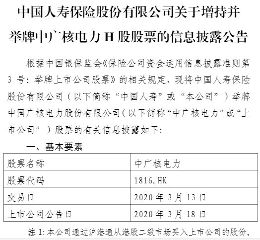 3月20日,中国人寿在保险业协会网站公告,增持并举牌中广核电力H股(1816.HK)股票。这是中国人寿系今年以来的第二例举牌,2月份刚举牌农业银行H股。