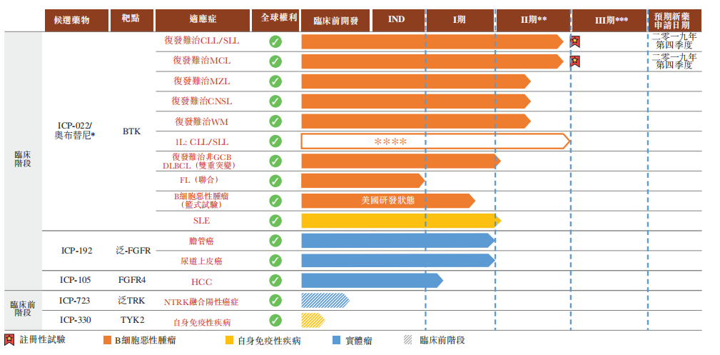 目前公司没有上市药品,企业收入主要产生自向生物制药公司提供研发服务。由于候选药品(包括奥布替尼、ICP-192及ICP-105)预期将于不远将来获批准后投放市场,未来收益来源预期将变得更加多样化。