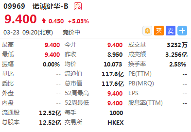 华盛资讯3月23日讯,生物医药新股诺诚健华首日高开5.03%,开盘报价9.40港元,最新成交额3.256亿,总市值117.6亿港元。