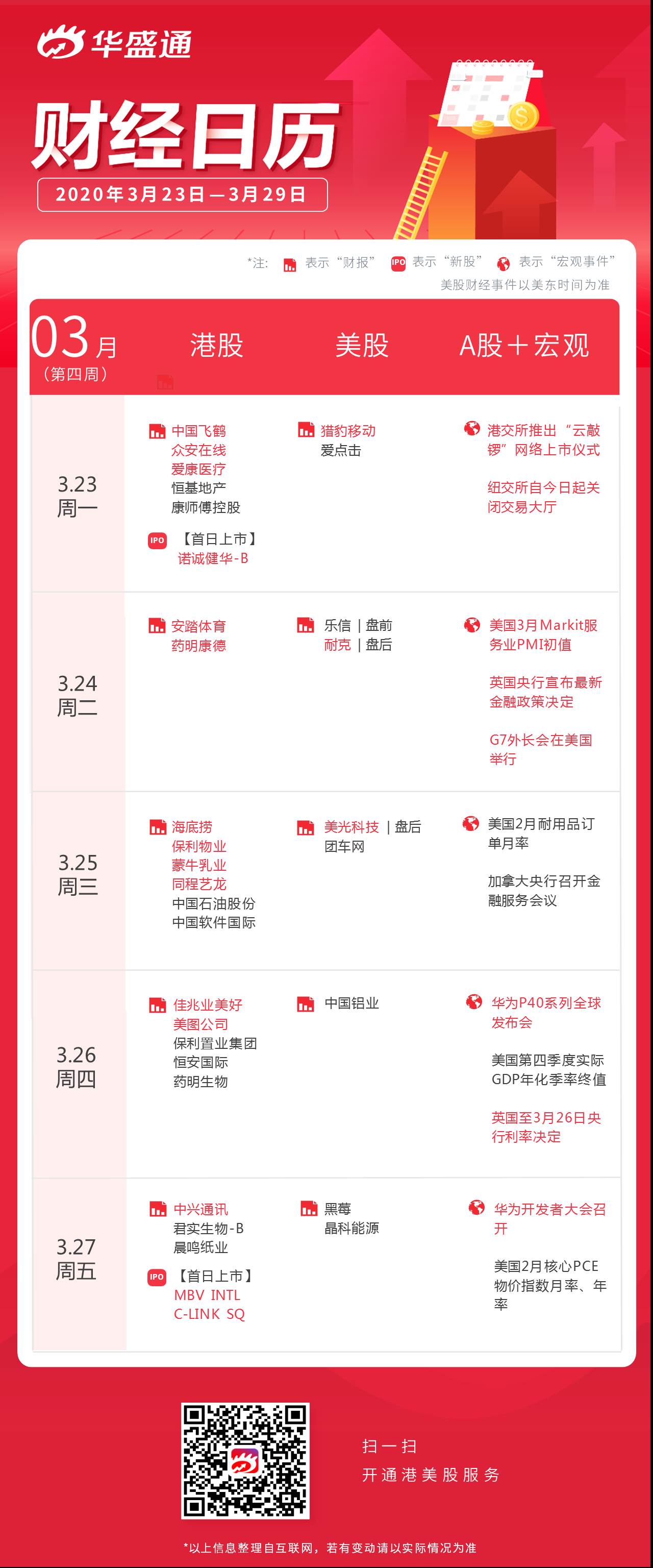 以上即为本周港美股、A股及宏观资讯一览,祝新的一周投资顺利~点击“日历”专区,了解本周更多财经大事↓