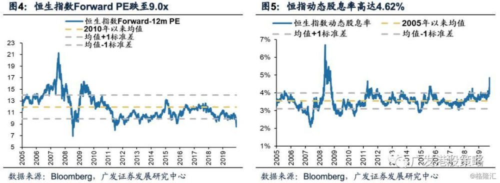 第三,动态股息率、Forward PE意味着继续大跌是“低概率”。港股Forward PE为仅为9x,已接近历史均值-2倍标准差;同时动态股息率已飙升至4.62%,超过历史均值+2倍标准差,均属于极限低估值;