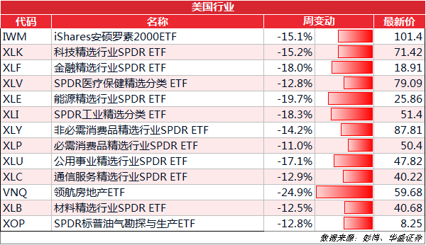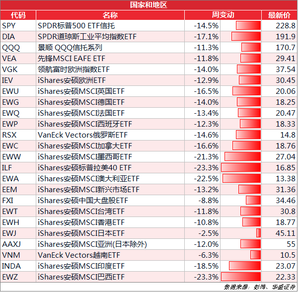又是惨烈一周,上周环球股市全线大跌。其中拉美40ETF跌幅最重,达到23.3%;MSCI日本ETF最抗跌,仅跌2.5%,越南和中国相关ETF其次,分别跌6%和8.8%。