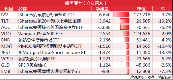 债券类ETF仍然占据流出榜多数席位,大都是宽基债券和长期国债产品。近期“卖出一切”的行情,使得资金从长期债券转向流动性更好的短债。