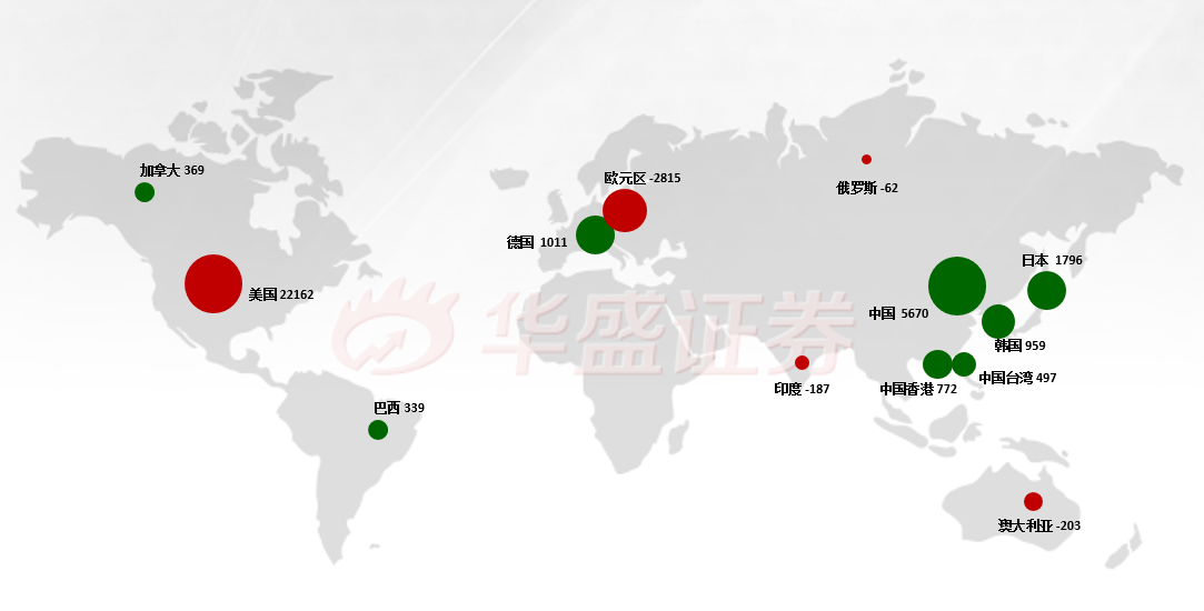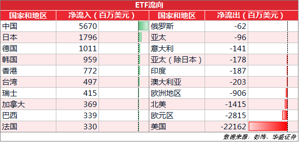 近222亿美元资金的净流出,使得以往长期霸占资金流入Top1的美国市场在上周罕见垫底。而中国市场扬眉吐气,获得57亿美元净流入,防疫表现相对不错的日本、德国市场也成为短期资金避风港。