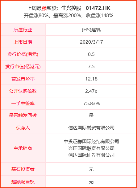 上周生兴控股爆冷一度大涨200%,成为上周最强新股。招股期间也是平平无奇,新股市场总会给人惊喜!