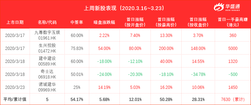 上周上市4只新股,算上今天上市的诺诚建华一共5只,平均中签率54.17%,5只新股4只上涨,上涨概率80%。首日平均最高涨幅50.28%,首日累计一手最高能赚7630港元。