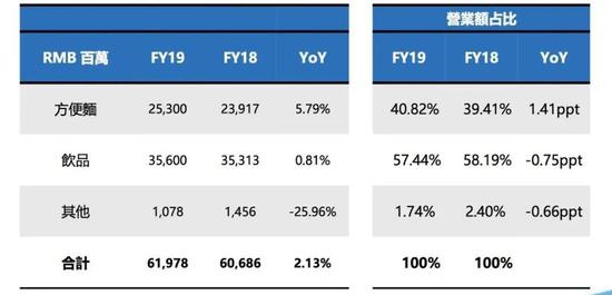其中,方便面业绩增长贡献明显,2019年营收为253亿元,占集团总收入的40.82%,收获5.79%的增长,加之经营费用减少,方便面业务净利润高达22亿元,同比上升28.74%。对比之下,饮料业务拖了后腿,营收为356亿元,同比增长仅0.81%,