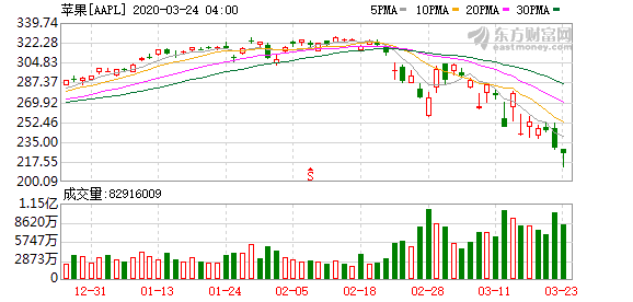 苹果公司股价再次下跌。当地时间上周五,苹果股价下跌15.54美元,报收于229.24美元,下跌6.35%,一度跌破1万亿美元市值。对比2月12日创下的327.22美元的高位,5周时间里跌幅近30%,总市值从14316.57亿美元降至10029.25亿美元。投行Wedbush表示将苹果公司目标价从400美元下调至335美元。