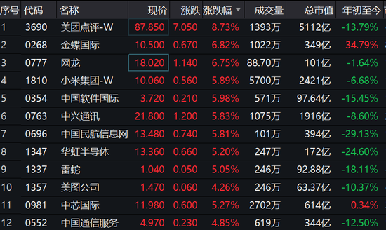 新浪港股讯 3月24日消息,科技股在香港集体爆发。其中,美团点评大涨近9%,报价87.85港元;金蝶国际、网龙涨近7%,小米集团大涨近6%,股价重返10港元;中兴通讯涨5.8%,华虹半导体、中芯国际涨5.2%,腾讯涨4.6%,阿里涨1.5%。