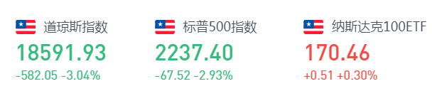 美股周一低开低收,道指开跌近400点,纳指盘中抽升转涨,唯美国参议院未通过经济刺激法案,三大股指继续震荡下挫。截至收盘,标普500指数跌2.93%,报2237.40点,抹去特朗普上台以来所有涨幅;纳指跌0.27%,报6860.67点;道指跌582.00点,跌幅3.04%,报18591.93点。