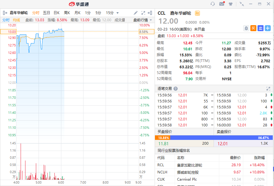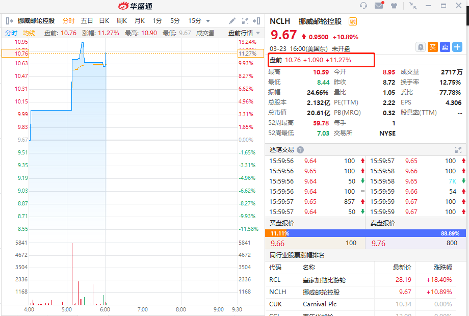周二(3月24日)美股盘前,部分邮轮股走高。
