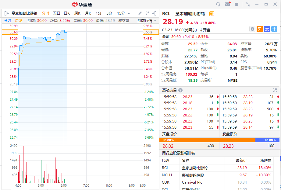截至北京时间18:05,挪威邮轮 (NYSE:NCLH)盘前涨11.27%,报10.76美元。皇家加勒比邮轮 (NYSE:RCL)盘前涨8.55%,报30.6美元。嘉年华邮轮(NYSE:CCL)盘前涨8.58%,报13.03美元。