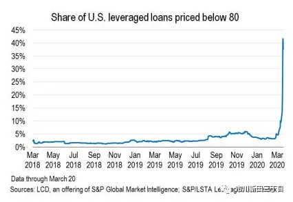 二级市场上的流通价格低于面值80%的杠杆贷款被认为是“不良债务”,如今有38%的杠杆贷款的成交价符合“不良债务”的定义,而3月13日的时候该比率为10%,一年以前为2%,数据来源为标准普尔公司杠杆贷款数据库,见下图所示。
