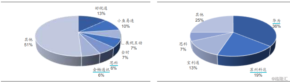 “在2018年我国视频会议行业中,华为以16.7%的市场份额再次蝉联中国视频会议市场占有率第一的宝座;其次是苏州科达,市场份额占比为7.8%,视联动力紧随其后,占比为7.0%,宝利通和思科占比分别为6.6%和6.3%,前五家企业合计市场份额占比为44.4%。”