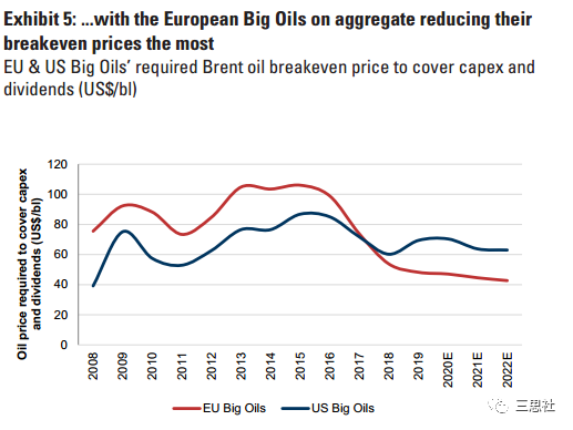 图13--全球油气巨头的盈亏平衡点(覆盖资本开支和股息)逐步下行