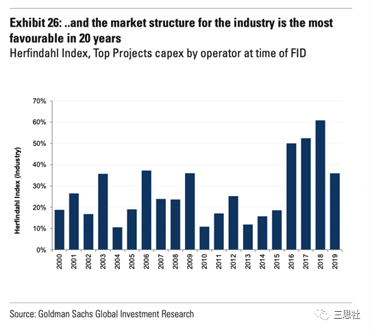 2014年以来,由于金融市场的融资偏好转向了“新兴”的低碳项目,“夕阳”的油气行业发生结构化变化:市场集中度上升(图18),进入壁垒提高。