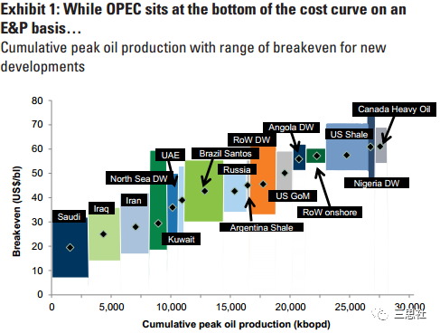 OPEC国家的原油开采成本依然是全球最低(图1),沙特、伊拉克、伊朗等国最新油田项目盈亏成本线已降至20美元/桶附近。