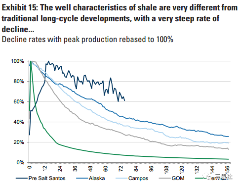 图7--页岩油井产量触顶后的下降速率高于传统油井