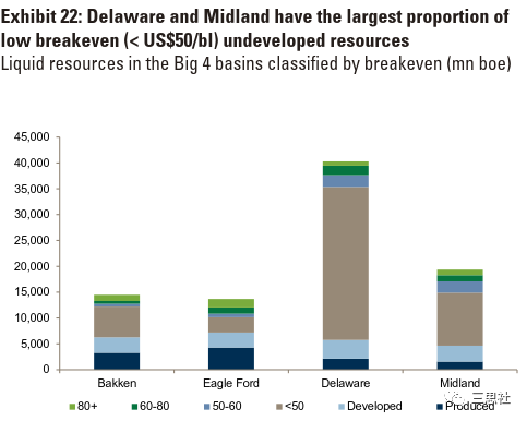 浅蓝色:盈亏成本低于70美元的未开采储备面积