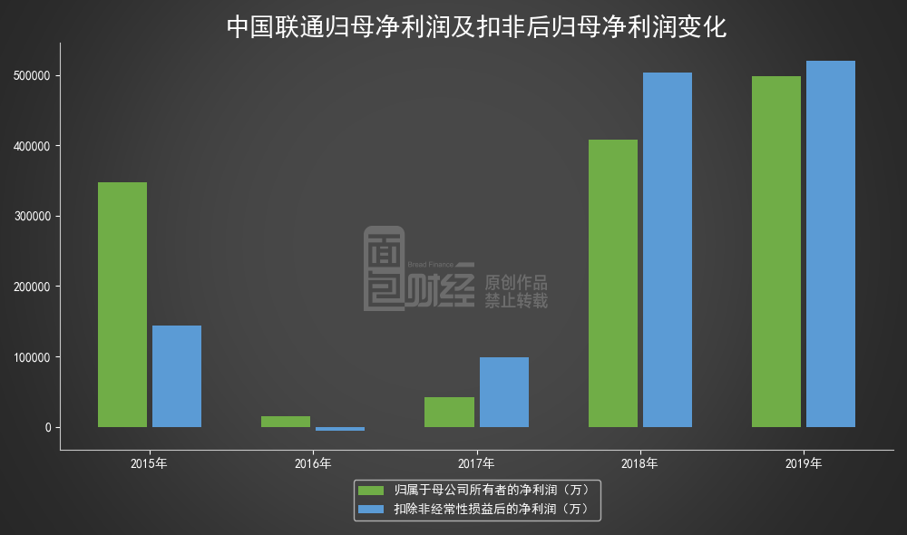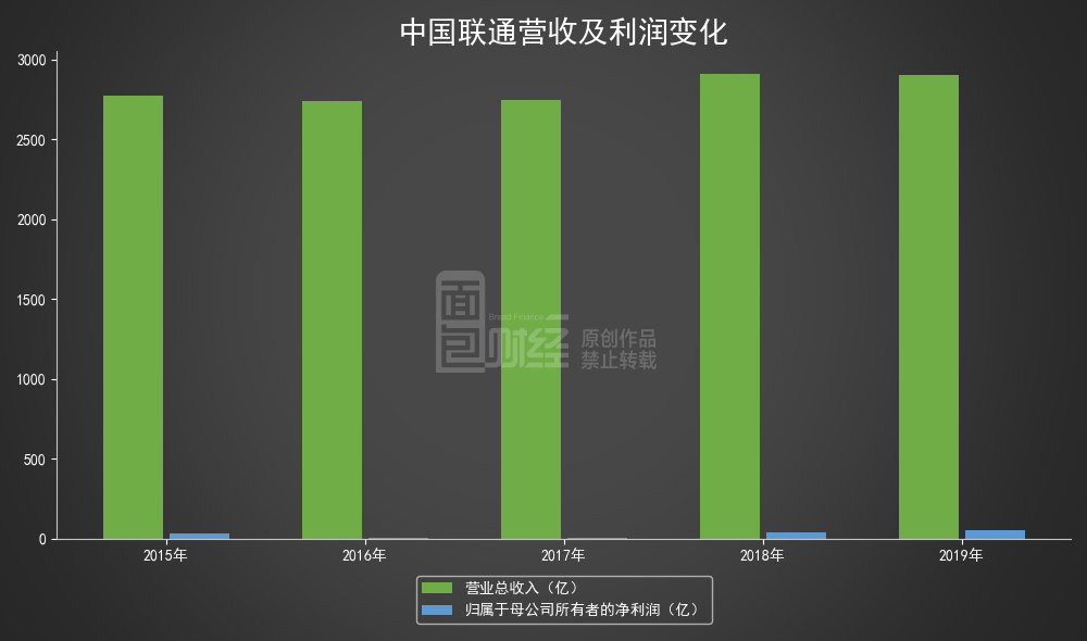 2019年,中国联通营业总收入约2905.15亿元;归母净利润约49.82亿元,同比增长22.09%。期内,公司非经常性损益约-2.16亿元,扣非后归母净利润约51.98亿元。