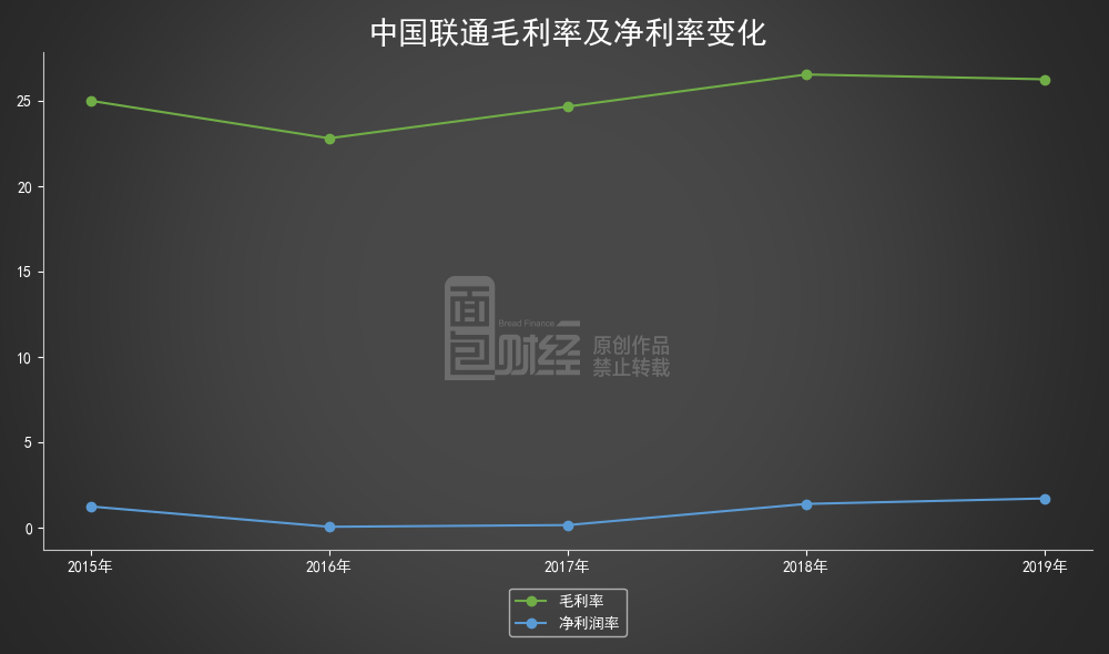 2017年、2018年及2019年,中国联通毛利率分别为24.69%、26.57%及26.29%;对应期间,公司净利率分别为0.16%、1.4%及1.72%。2019年,公司毛利率同比下滑,净利润率同比提升。