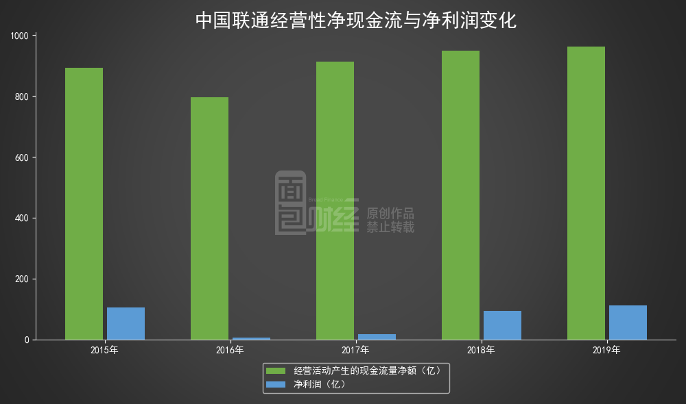 2017年及2018年,中国联通经营性净现金流分别约913.35亿元及948.3亿元,同期净利润分别约16.84亿元及93.01亿元,净利含金量分别为54.24及10.2。