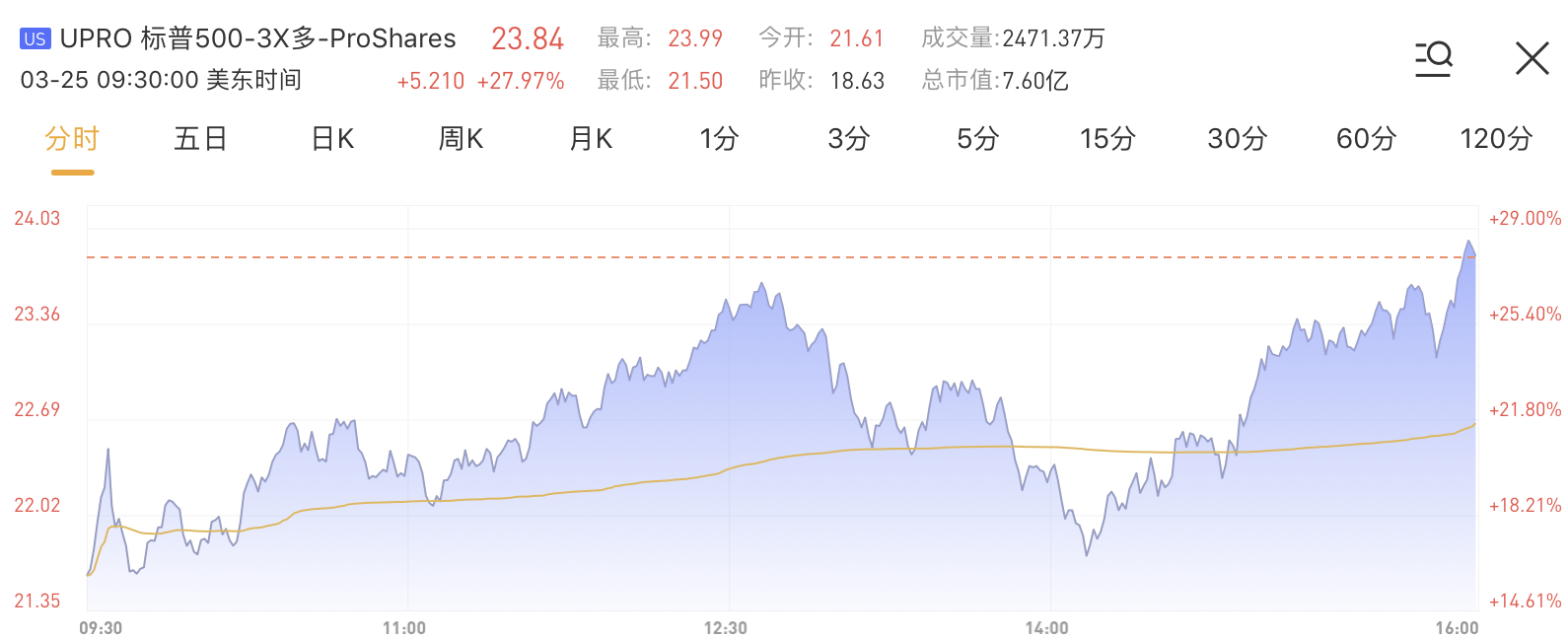 以三倍做多标普500(UPRO)为例,昨日标普500指数大涨9.38%,而三倍做多标普500收益高达27.97%!相当于三倍于标普500指数的收益。