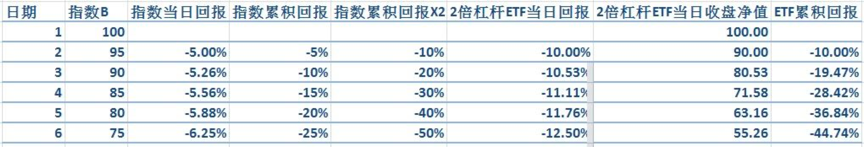 再看单边下跌走势:假设指数连续下跌5日,中间没有一点反弹,那么最终当B指数累计亏损25%时,两倍做多ETF只亏损44.74%,比指数亏损25%的两倍要少。