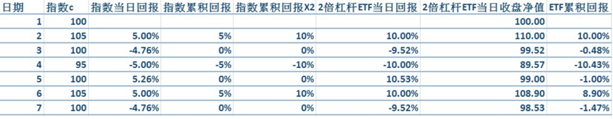 最后看震荡市:如果让指数涨一天,第二天跌回原地,会发生什么呢?神奇的地方来了,统计表格会显示,6个交易日后原指数回报为零,然而2倍杠杆ETF的累计回报却为-1.47%。