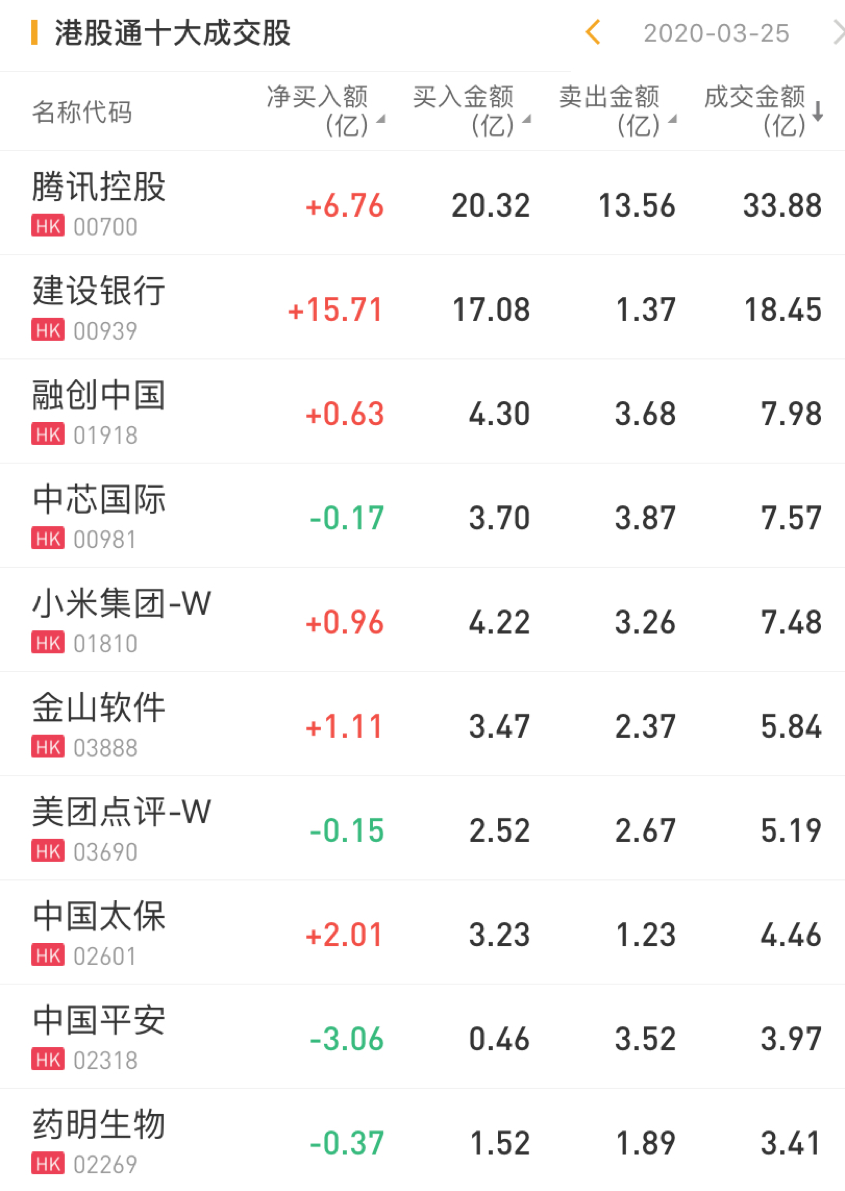 今日净买入腾讯控股6.76亿港元,净买入建设银行15.71亿港元,净买入融创中国0.63亿港元,净买入小米集团0.96亿港元。