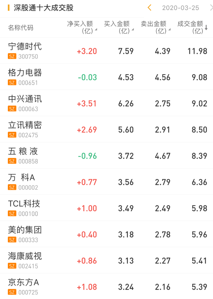 深股通净买入宁德时代3.20亿元,净买入中兴通讯3.51亿元,净买入立讯精密2.69亿元。