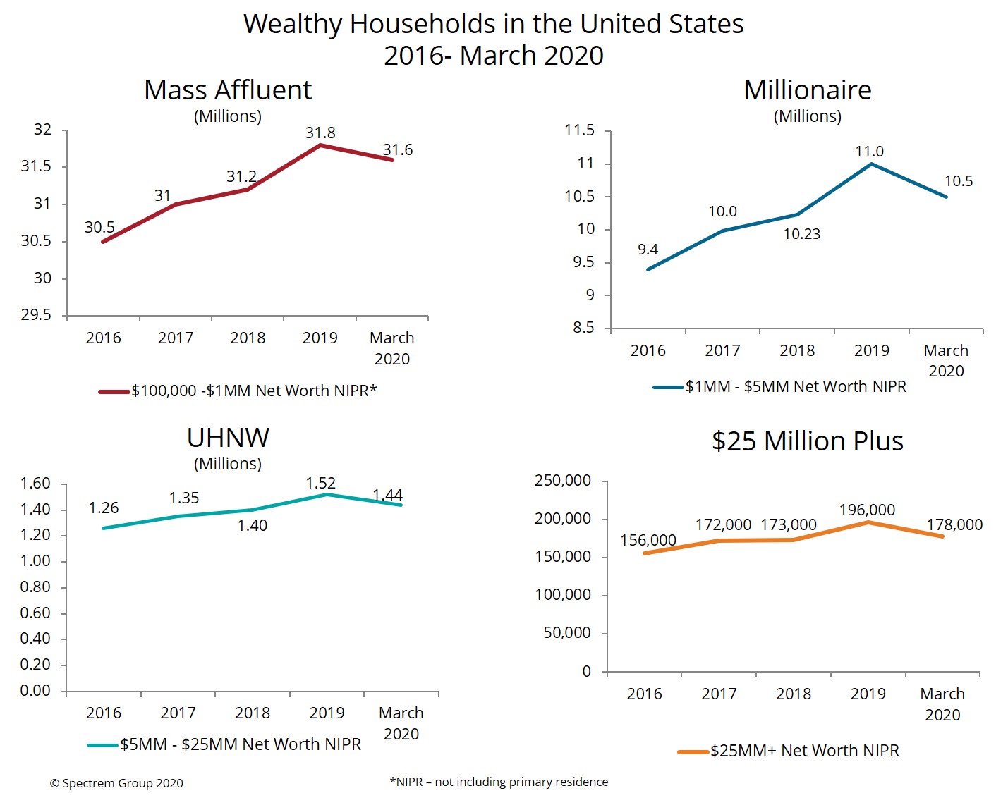去年年底,美国富人数量连续第11年增加,百万富翁人数达到前所未有的1100万。然而,疫情对经济的冲击和股市暴跌,使得这一情况发生变化。研究公司Spectrem Group数据显示,截至3月20日,美国拥有100万美元以上净资产的家庭数量至少减少了50万个。