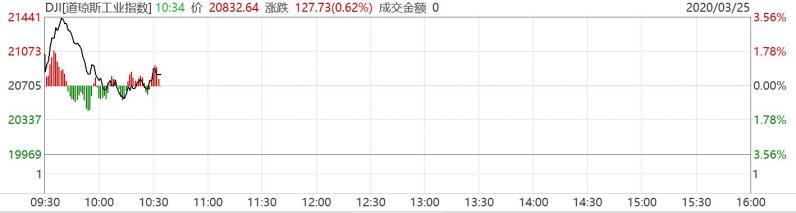 美国国会议员与白宫达成协议后将推动一项2万亿美元的经济刺激计划,帮助提振美国经济。道琼斯工业指数(Dow Jones Industrial Average)在开盘一度上涨628点,至21333点,涨幅3%,延续了周二创下的87年来最大单日涨幅。标准普尔500指数上涨1.8%,纳斯达克综合指数上涨1.4%。然而在此后不久,空方迅速把道指推低,道指一度甚至下滑。