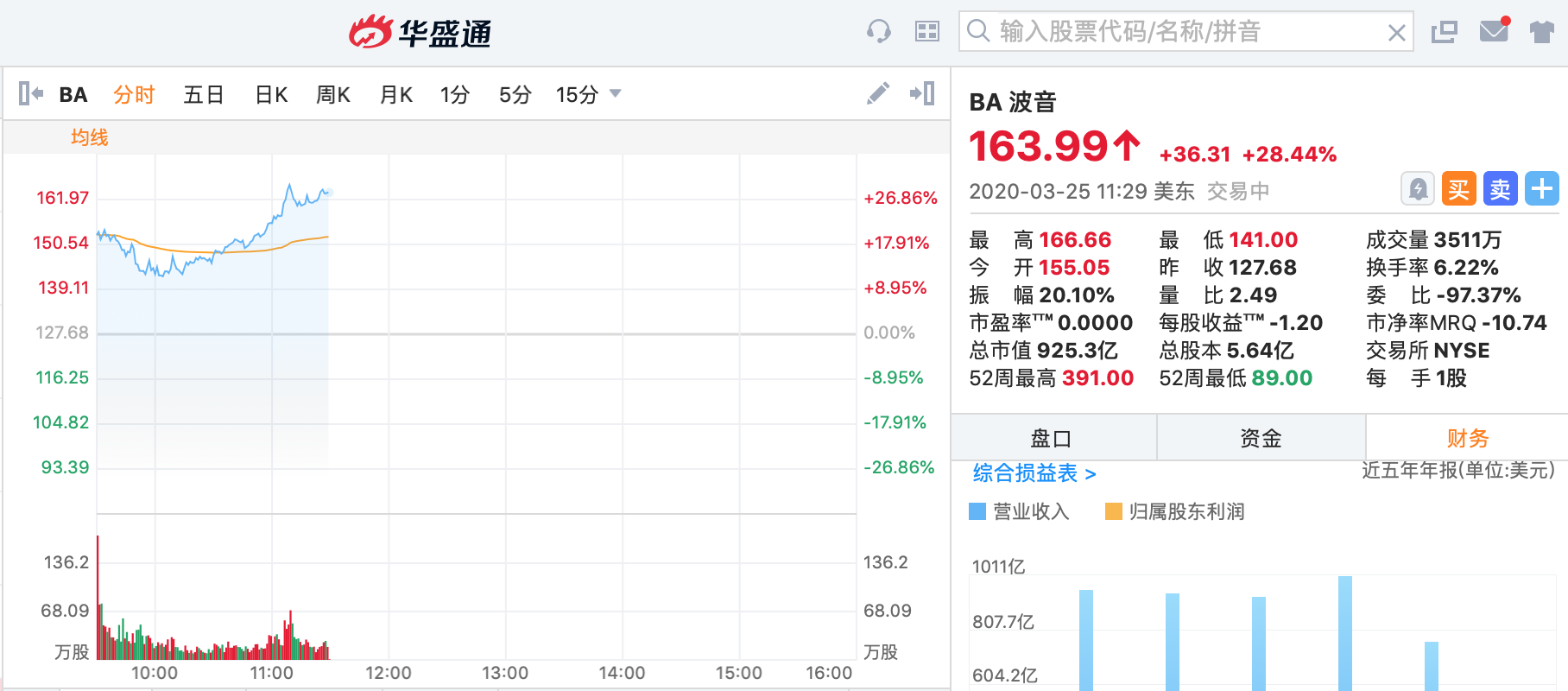 华盛资讯25日消息,波音盘中涨幅继续扩大,截至发稿,涨28.44%,报163.99美元,已连续3日飙升,累计涨近70%。