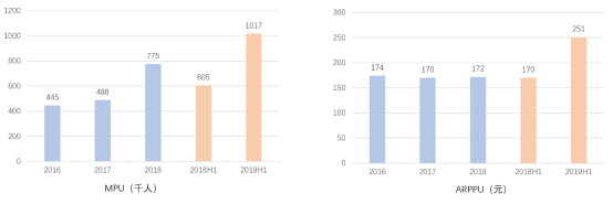 此外中手游的付费用户量和用户付费水平还在不断提升。平均每月付费用户数(MPU)由2018年上半年60.4万增加至2019年上半年101.7万人。每名付费用户月平均收益(ARPPU)由 2016 年的 138 元提升至 2019 年上半年 250.6 元。