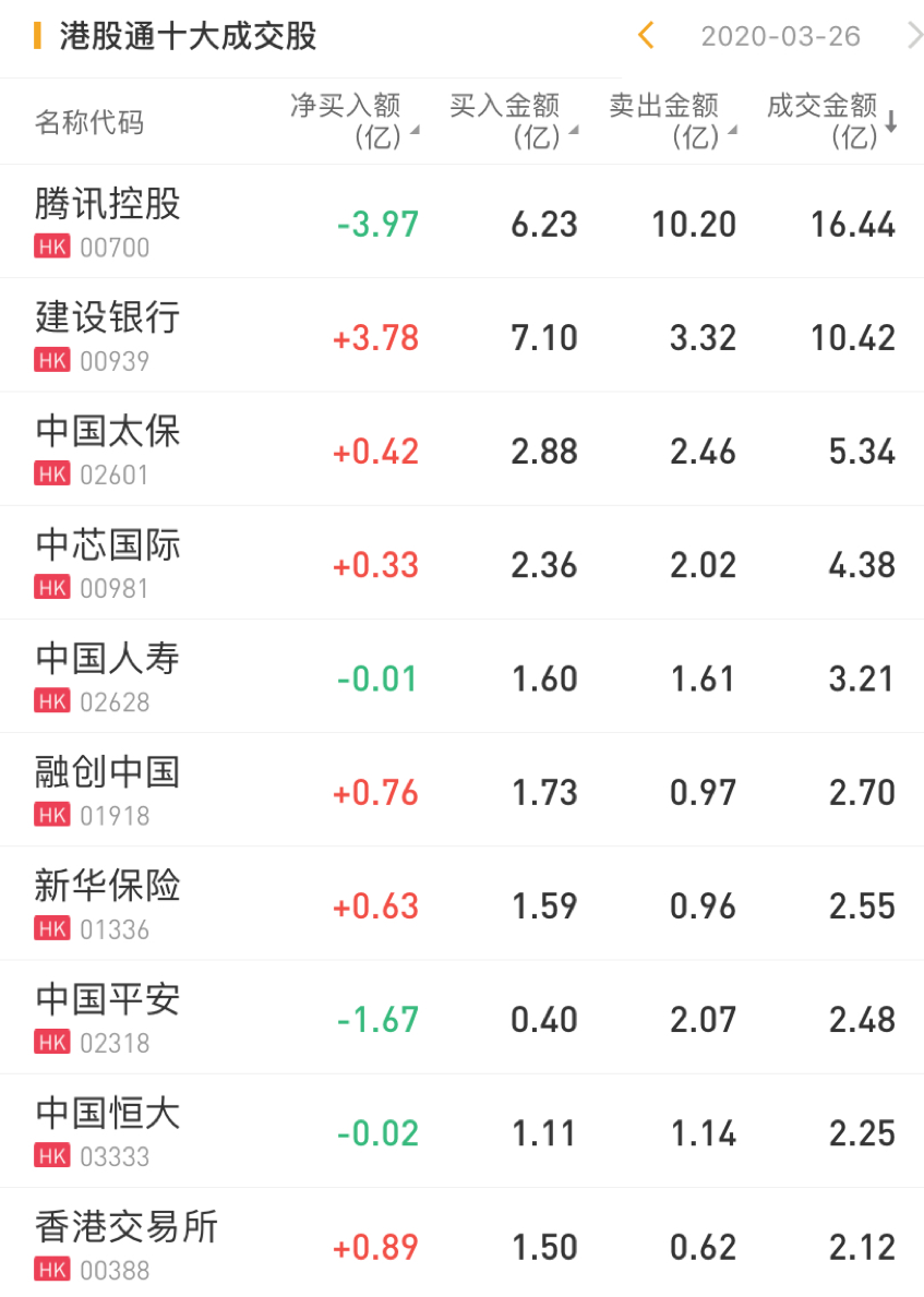 今日净卖出腾讯控股3.97亿港元,净买入建设银行3.78亿港元,净买入中国太保0.42亿港元,净买入中芯国际0.33亿港元。