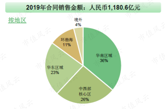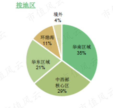 另外,按照地区分类,华南区域占比最大为36%,其次是中西部核心区和华东区域,占比分别为26%和23%,最后是环渤海和境外,分别占比11%和4%。