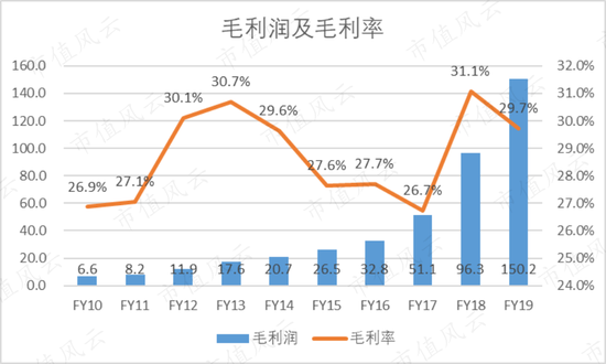2019年,毛利润为150.2亿元,同比增长56%,毛利率略微下降1.4个百分点。从近两年的毛利率水平来看,已经从2017年的26.7%回升到了30%左右的水平。